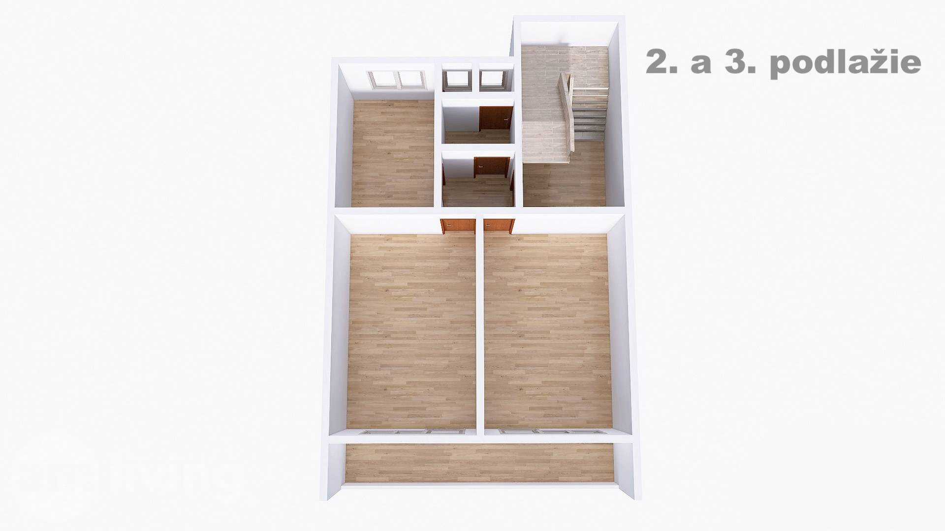 • 2. a 3. podlažie 81 m² + 10 m² loggie – dve identické samostatné 2-izbové bytové byty s loggiou (jeden aj so záhradkou druhý s pivnicou na poschodí)